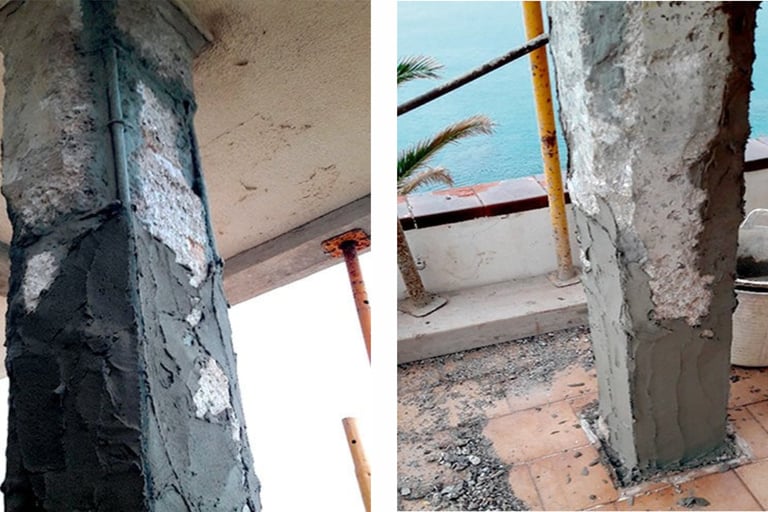 Repairing rusted reinforcement requires breaking concrete, cleaning/replacing bars, and recasting or rejacketing